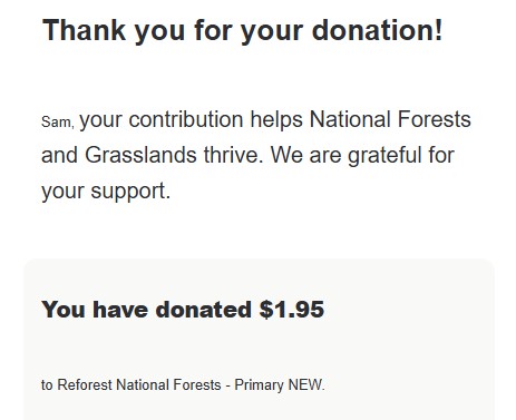 For November 2024, Sam’s Prints proudly donated $3.57 to the National Forest Foundation, supporting critical conservation efforts. Thanks to their 1:1 match program, this contribution planted 6 trees!